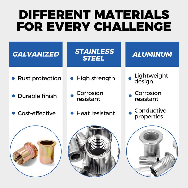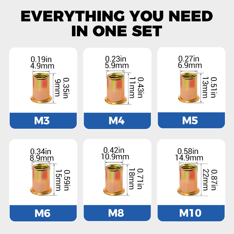 UNIVERZÁLNÍ POUŽITÍ – Ideální pro různé aplikace, tyto závitové vložky poskytují bezpečné a spolehlivé řešení pro upevnění dřeva, kovu a plastu. Ať už pracujete na nábytku, automobilových projektech nebo řemeslných pracích, tento set se přizpůsobí vašim různorodým potřebám! Objevte možnosti použití. VYSOCE KVALITNÍ MATERIÁL – Vyrobeno z prémiových materiálů, naše nýtovací matice nabízejí vynikající pevnost a odolnost proti korozi. Mějte klid na duši, že vaše projekty budou vydržet i v náročných podmínkách. Kvalita, které můžete důvěřovat pro všechny vaše úkoly! Přečtěte si o materiálech.